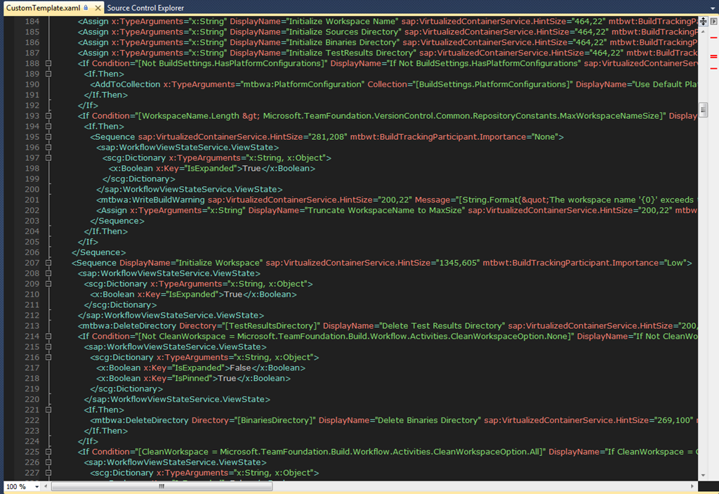 Compared to the 2008 version where MSBuild was used, the build system in version 2010 is based on Microsoft Workflow Foundation. That means much longer templates and more work for the admin – but we’ll get to that soon. The bottom line is, that when configured properly, it relieves the developer from repetitive tasks allowing to focus on what’s more important – coding. Here’s a screenshot of how a build template looks like, and it’s actual form – xml.