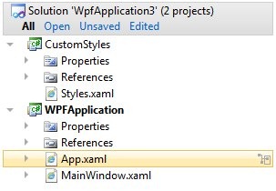 and we want to extract the styles from section Window.Resources, place them in separate dictionary file and in separate assembly. First we add a class library project to our solution and name it for example CustomStyles. Then we add an xml file to this library and name it for example Styles.xaml. Our solution now looks similar to this