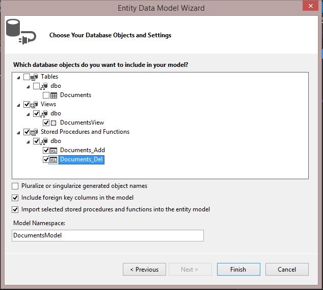 After clicking on Finish the edmx designer should be displayed. We right click on or DocumentsView and choose the Stored procedure mapping. Then we map the Documents_Add and Documents_Del procedures as follows