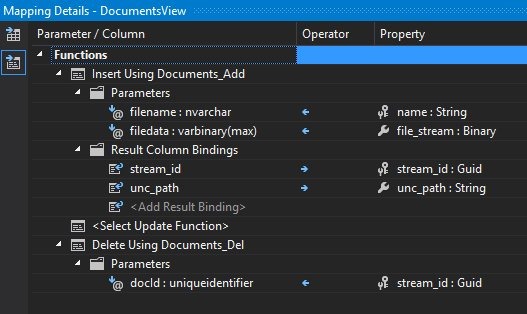 - We will create a view on Documents File Table which extract only those data we need and we map this view in EF