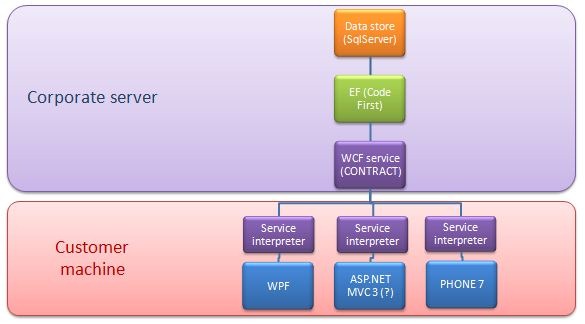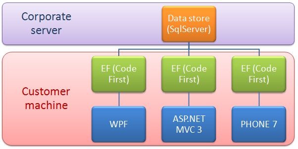 By Mirek on (tags: OData, WCF, WP7, categories: architecture, infrastructure)Let’s assume there is an application database and the various client applications developed in Windows Presentation Foundation, Silverlight, Windows Phone 7 and ASP.NET MVC 3. The database is either MS SQL Server or MS SQL Server CE. Now the potential customer may use one or many of these applications/platforms so the connections to the database must be performed from all of these clients.