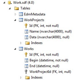 As you can see the Entity Framework creates all necessary keys. By default the integer typed Id field is treated as primary key for the entity table. Additionally the Framework detects the reference in Work class to the WorkProject class and created appropriate foreign key. This is generally very convenient functionality that we do not need to worry about the basics of the database schema.