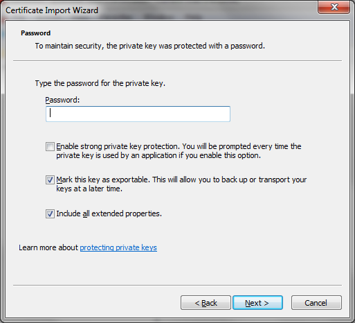 - Provide a password (if your certificate has one) – leave the “Enable strong private key protection…” option unchecked, and select the “Mark key as exportable…” (this may come in handy at some point). Check the “Include all extended properties” and press “Next”