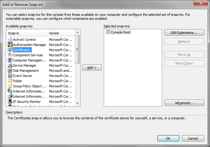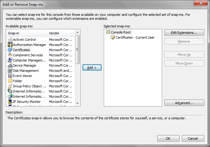 - Press ctrl+m or select File –> “Add/Remove snap-in”