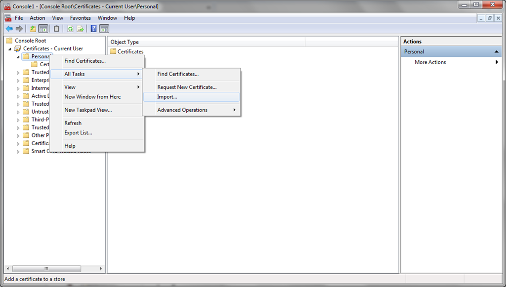 - Expand the tree on the left and right click on “Personal” node. Then select “All tasks” –> “Import…”