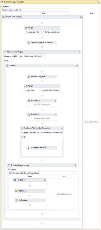 And that should handle the “Publishing” part – that is preparing the files to be transferred to the test server. Before I do that, I need to clean the destination location on the server by running “FtpClean” and transfer the files using “FtpTransfer”. Here’s the source code for these activities:
