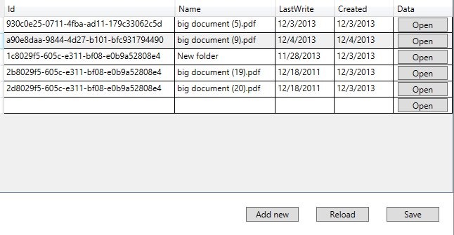 We have few columns mapped into a DataGrid. The Id column represents the stream_id column of FileTable. A Data column is mapped to a binary content of the file. The file is stored on local disk and opened with default windows associated process when user clocks on Open button. Above table is already filled up, but we will yet get to how to retrieve data from FileTable.