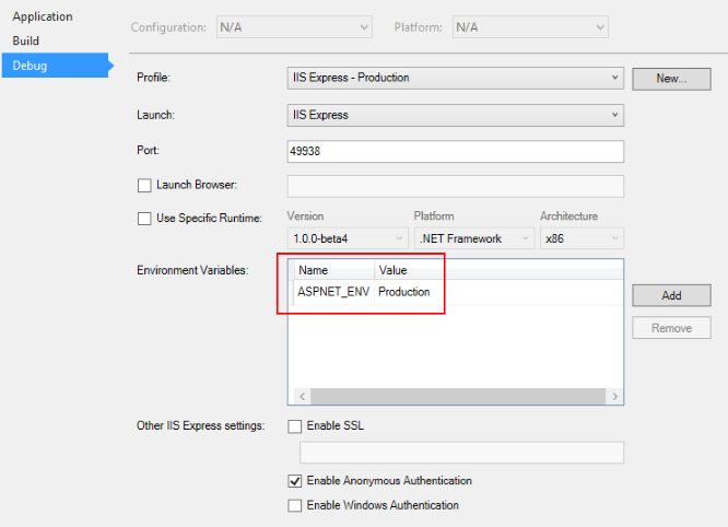 If we are working in Visual Studio 2017 then we can specify environment in the debug profile of our application: