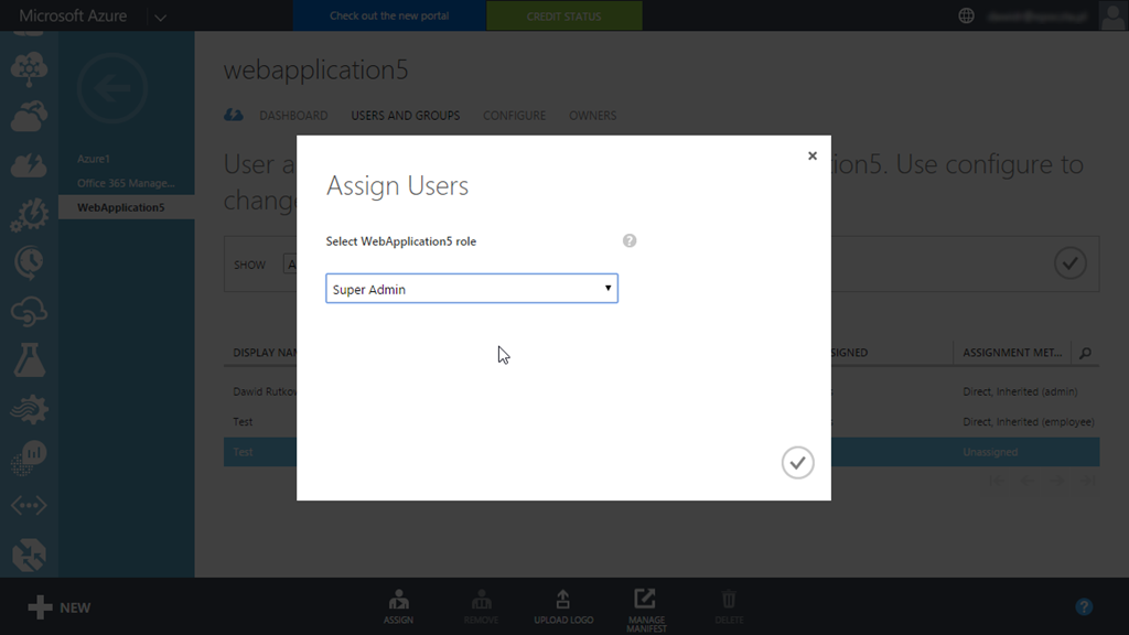 When you will upload your updated manifest file you will be able to assign users to custom roles. Navigate to the users tab under the application to which you would like to assign users and groups. Select a user and click on the Assign action on the bottom bar. Here you can assign the desired role to the user. Only the global administrator or the user administrator of the directory can assign application roles.