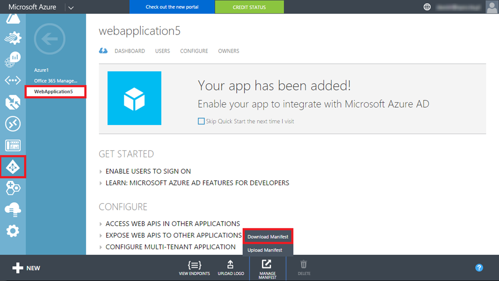 Custom application roles can be defined in Azure Management Portal in our application manifest file. All you need to do is to download your application manifest file by clicking Download Manifest: