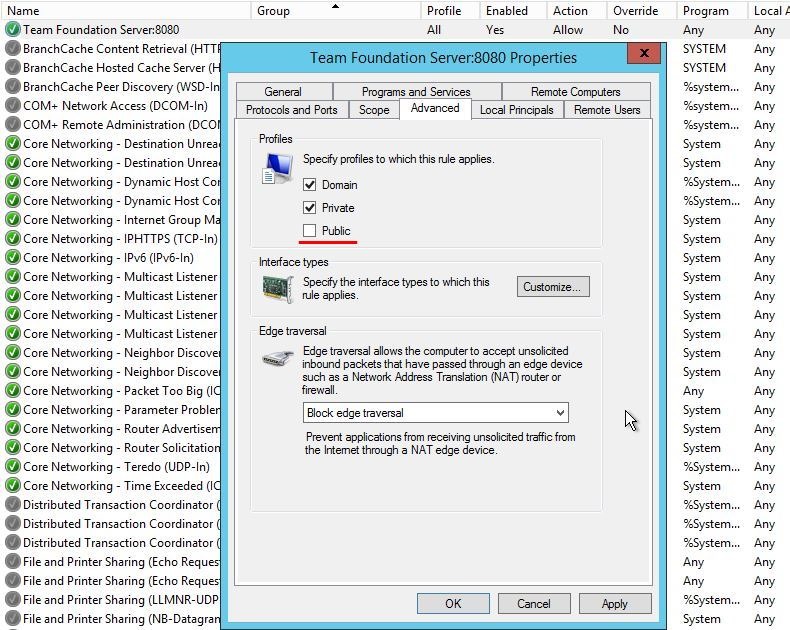 Once we have the TFS server installed on the remote machine we also need to configure the firewall rules so we can access it from local pc. By default the tfs installer add new incoming firewall rule on port 8080, which is the default port for accessing the TFS web portal. However you may find problems accessing the web portal from the local pc. Then first thing is opening the Team Foundation Server:8080 rule and checking the Advanced\Profiles section. It would looks like this