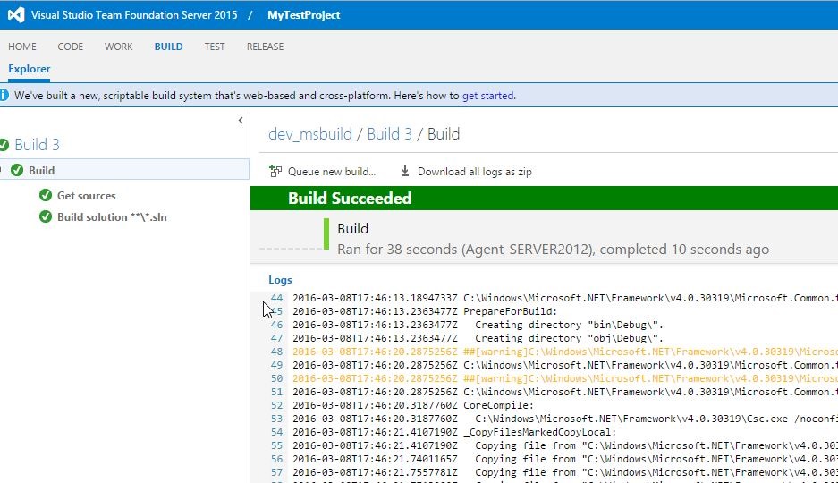 This is caused by lack of Visual Studio compiler on the agent machine. This is true since we didn’t install the Visual Studio there and we don’t want to install it on the build machine. So the only solution is to use the msbuild compiler instead. Create new build definition from empty template and add new build step to it (section build –> MSBuild). Queue the build and you will see that now it will succeed. The build agent took the msbuild version installed with the .Net framework and used it to build the solution.