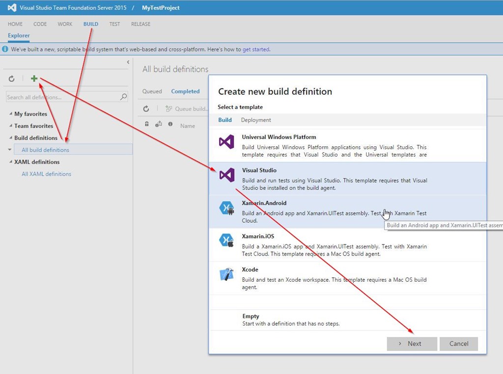 Here you can create and manage your build definitions. You can create old type XAML based build definitions. This is useful if you already have a complex build definitions in previous version of Team Foundation Server and you want to port them into new TFS. There is however new recommended build engine called Build vNext in TFS 2015 and we will use this. So create new Visual Studio Build definition as shown below