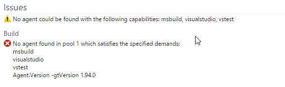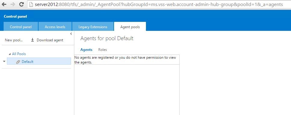Here you can see that no build agents are registered yet. You will however have a default one here visible and running if you check the option during the TFS setup which says