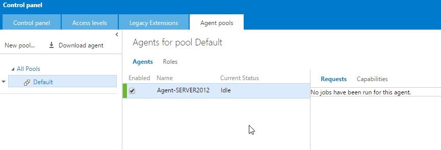 Next step is to configure the build agent. In Team Foundation Server 2015 we can have many build agents. Each of them can be running on a different machine. The build agent works on one team project collection and must be first deployed to the target building machine. More on that can be found on MSDN. If we run the TFS setup with the default settings then we already have a team project collection callled DefaultCollection and we also have the default agent on this collection ready to be configured and register. We can check that on http://server2012:8080/tfs/_admin/