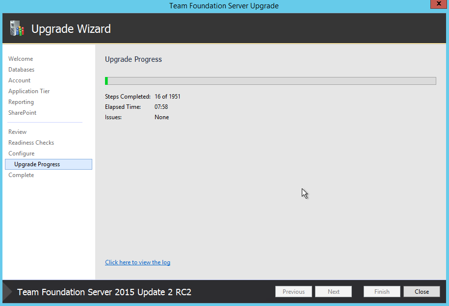 This is the current situation: I have TFS 2010 SP1 running on one server. The databases weight about 9GB together. Now the goal is to move the TFS to the new machine and upgrade it to TFS 2015. As it turned out the process of upgrade is quite straight forward (MSDN). Since TFS 2015 supports upgrade from TFS 2010 then it goes smooth. Thanks to the fact that TFS keeps everything in SQL Server databases all you need to do is basically backup your databases and restore them on new location. Then let the TFS 2015 do the rest. But let me put it in step by step list.