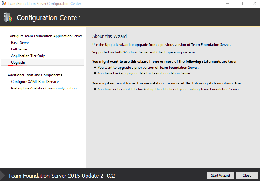 - Start TFS 2015 installer and, when the Configuration Center shows up, select the Upgrade wizard