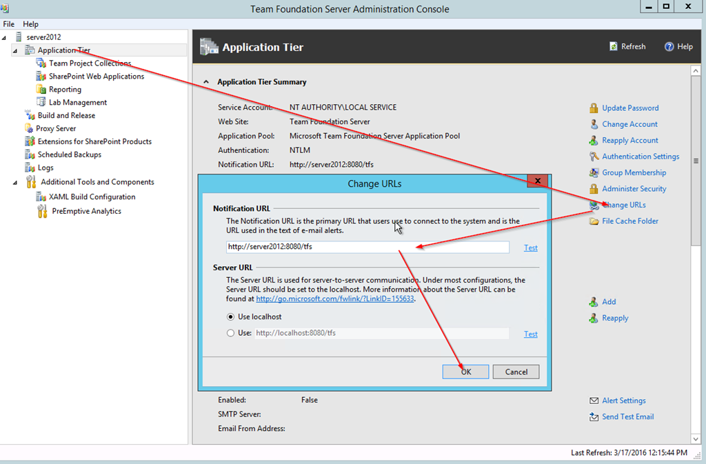 - After reboot open TFS Adnimistration Console and update the notification url in the Application Tier section