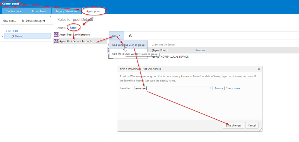 As described here we need to add our user account to the Agent Pool Service Accounts like this
