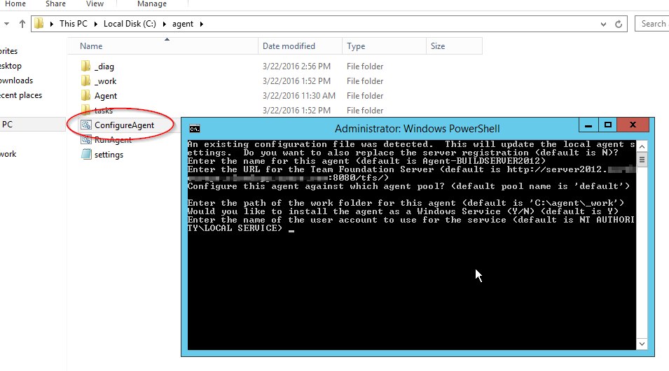 The machine where the build agent is going to be installed runs on a different domain than the TFS Server. So first we go to the TFS web portal and download the build agent, unzip it and run the ConfigureAgent script to install it on the build machine