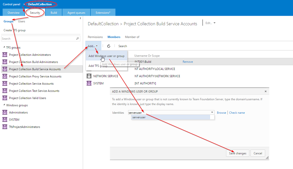 This time another place where we have to add our build account. This is a Project Collection Build Service Accounts