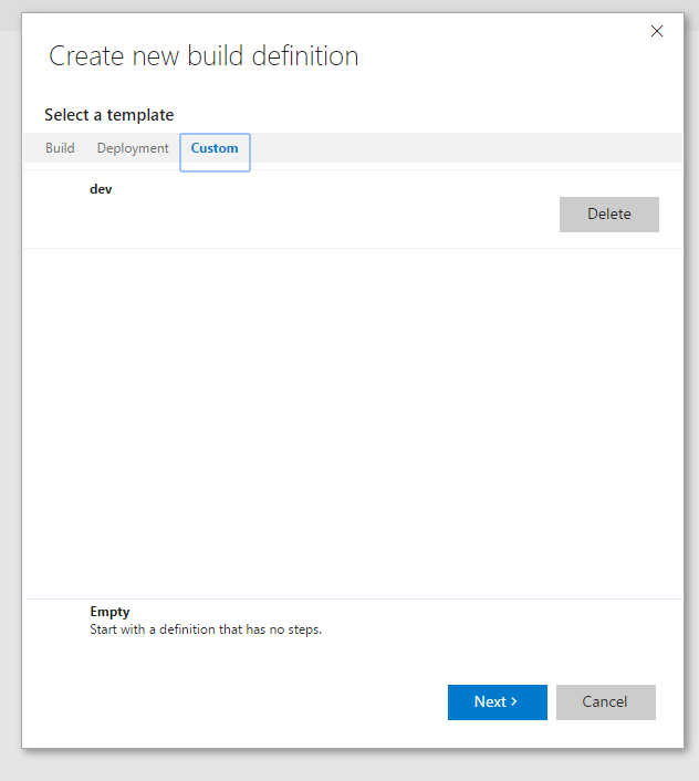 Assumming we have a team project “MyProject” and a build definition template in it called “dev” and we have a team project “SecondProject”, we can easily copy the build definition template using above function. We do it like this: