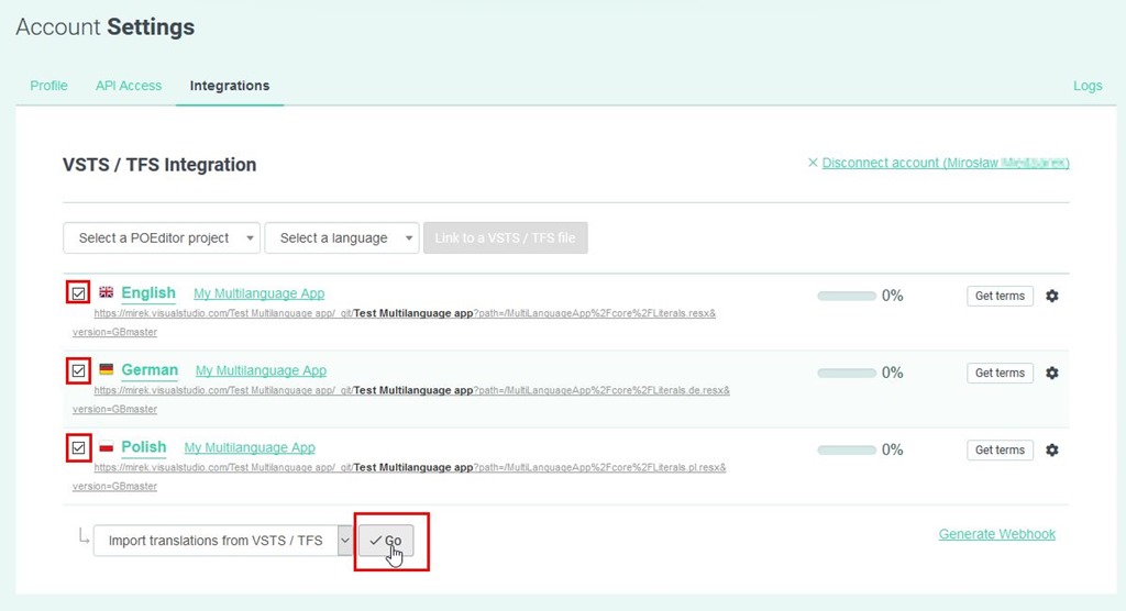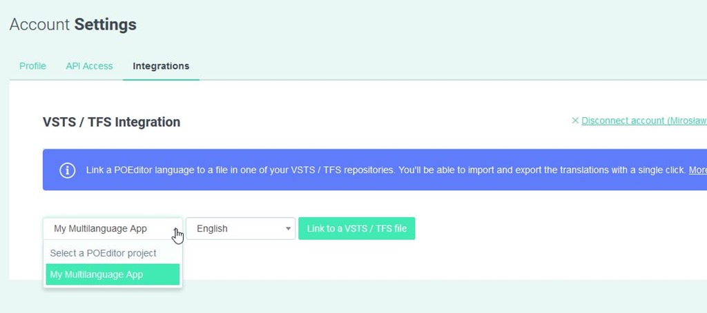 Next, go to integrations options here and connect your POEditor account to the Visual Studio Team Services. Follow the instructions.