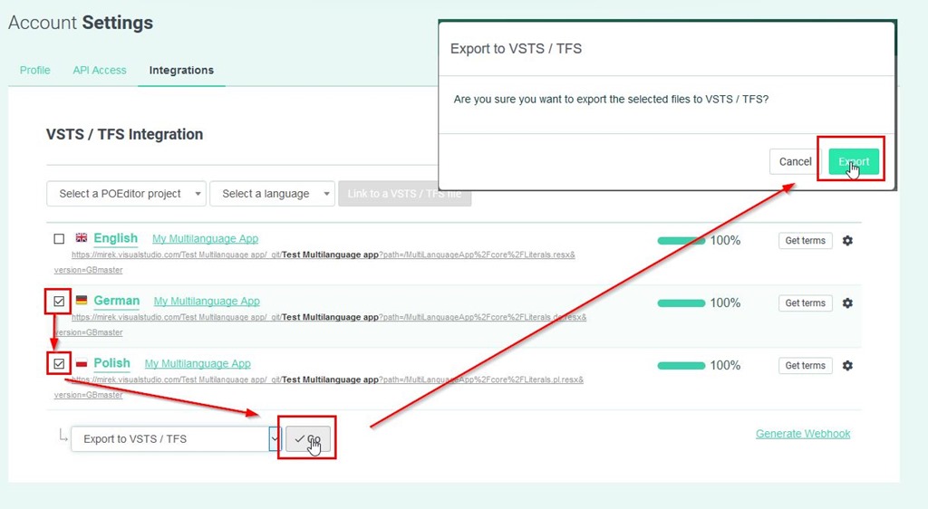 After all your translations are ready you can upload them back to VSTS. Got to the integrations settings again and hit Export this time for the German and Polish languages selected.