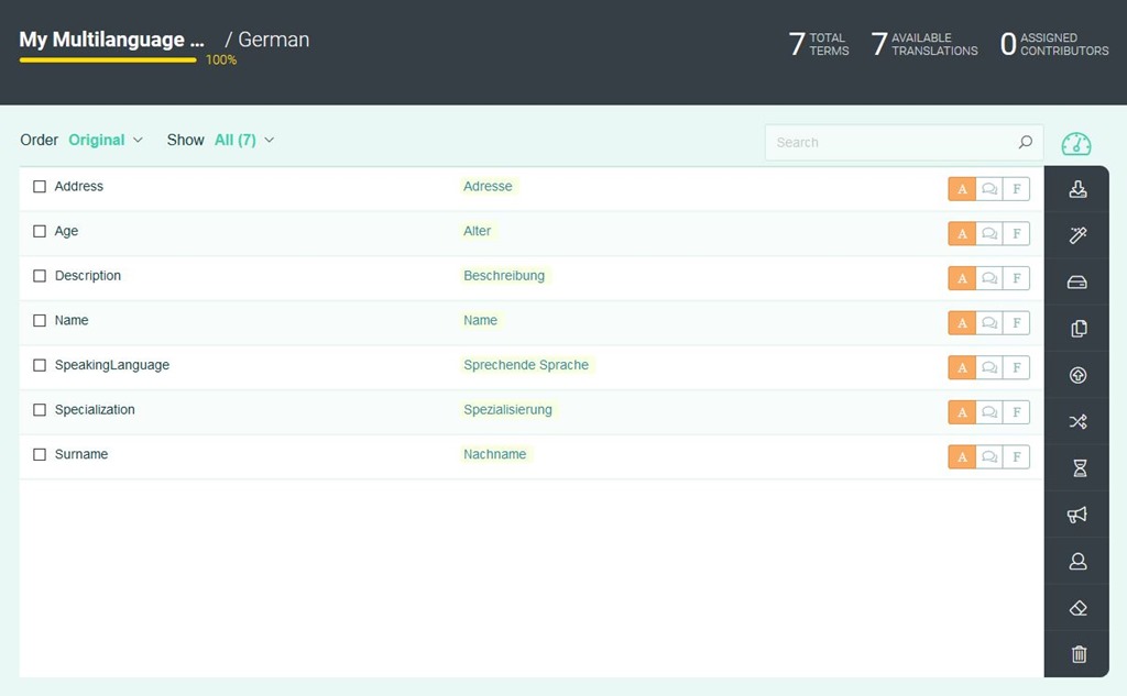 After we’ve imported the terms we can use all the functionality of the POEditor.