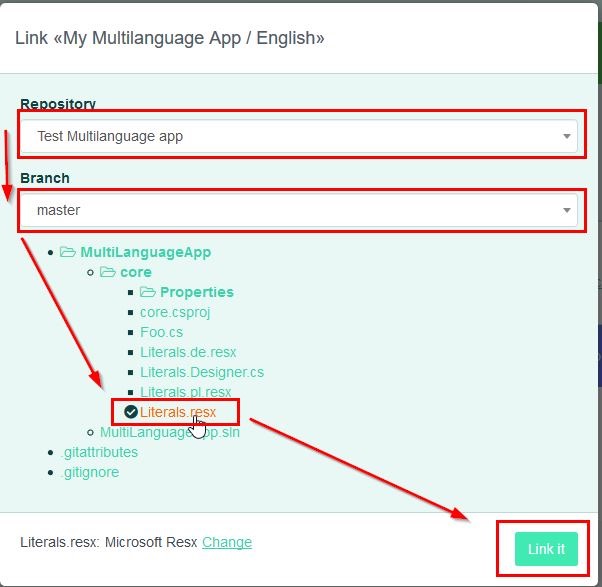 Ok, we have the POEditor account connected to VSTS. Next thing we need to do is to tell POEditor which file in our GIT repo contains which tranlsation of our project. To do that let’s back to the settings integration page and point to our resx files in VSTS repo.