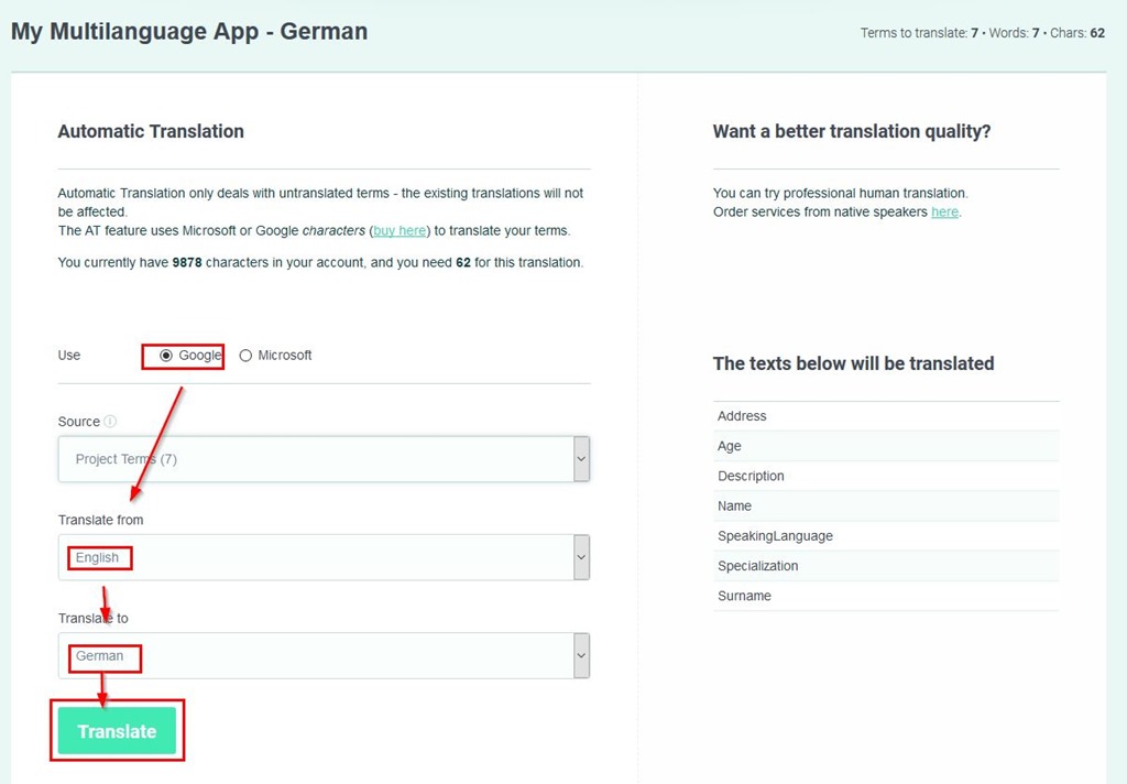 You can choose here which translation service you want to use. In a free subscriptions there is Google and Microsoft. Not sure if there are more in higher options, but those two are good enough to have quite acurate translations in most cases. Select the source and target languages and hit Translate. After all you get the translations which you can eventually refine manually.