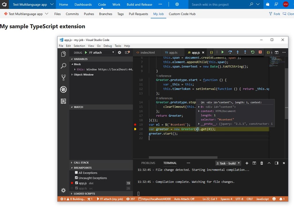 That’s debuging. But the things are different when you want to write some code, test it, correct it, test it again and so on. We cannot do it in our development environment directly, because we have no VSTS context. But fortunatelly we can attach to the browser running our VSTS extension online. See how to do it.