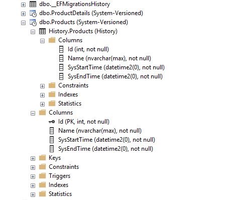 Now assuming we have a default DbContext defined and default initial migration for the database, which creates an empty database schema, we want to make both tables Products and ProductDetails a temporal tables so all changes made to both tables will be tracked and we can later retreive the history of all changes. According to documentation we must alter each table and add required datetime2 fields. Basically we have to run following script