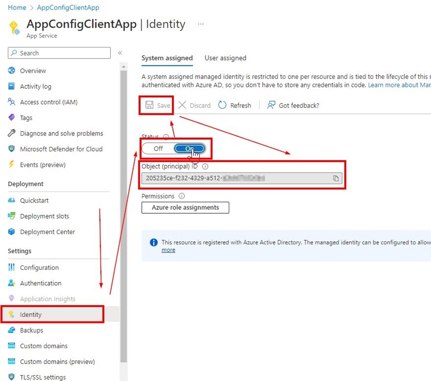 Go to your App Service, then select Identity on the left side toolbar, then System assigned, switch Status to On, Save and grab the Object ID which uniquelly identifies you app service identity. (In case you ask, presented example apps and configuration together with entire resource group does not already exist while you’re reading this post
