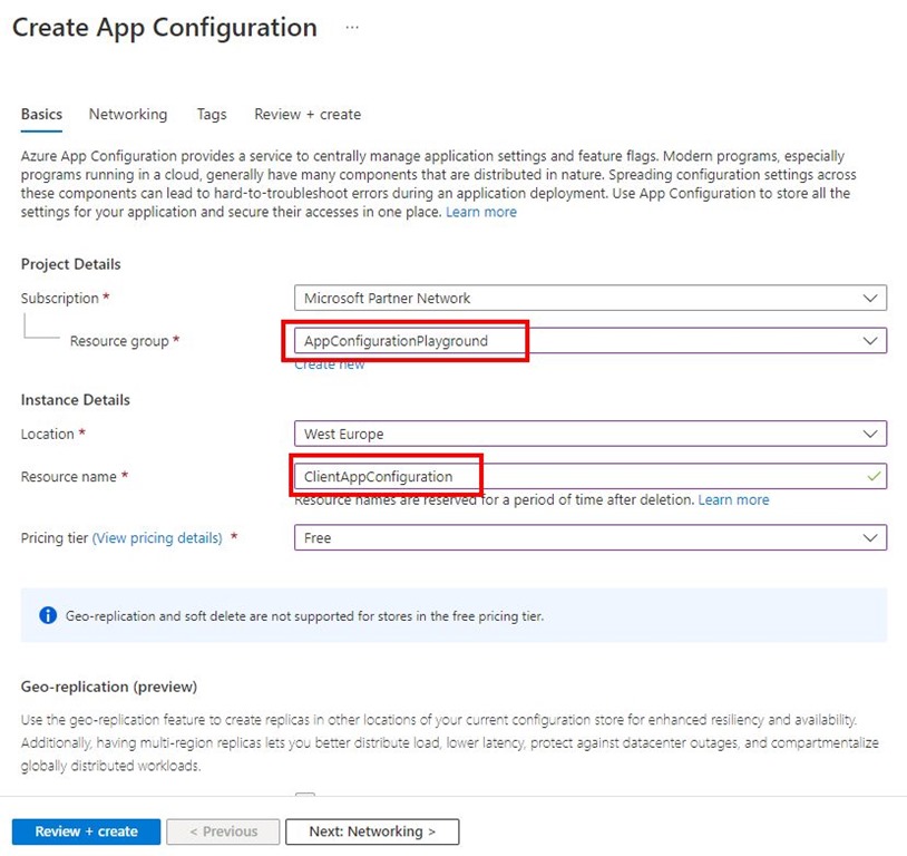 This step is quite straight forward. You can follow the Microsoft guide one that, but basically you need to setup the target resource group, unique app configuration name, region and the pricing tier. For testing purposes you can use Free tier as shown below