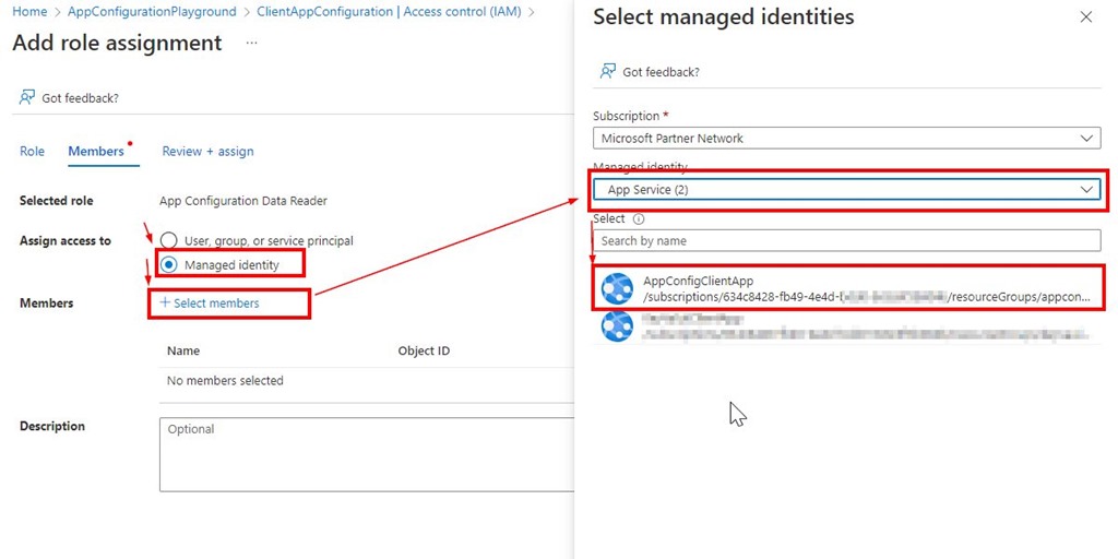 In App Configuration view select Access control then Add role assignment, then select App Configuration Data Reader role and select memebers from the App Services list ass follows