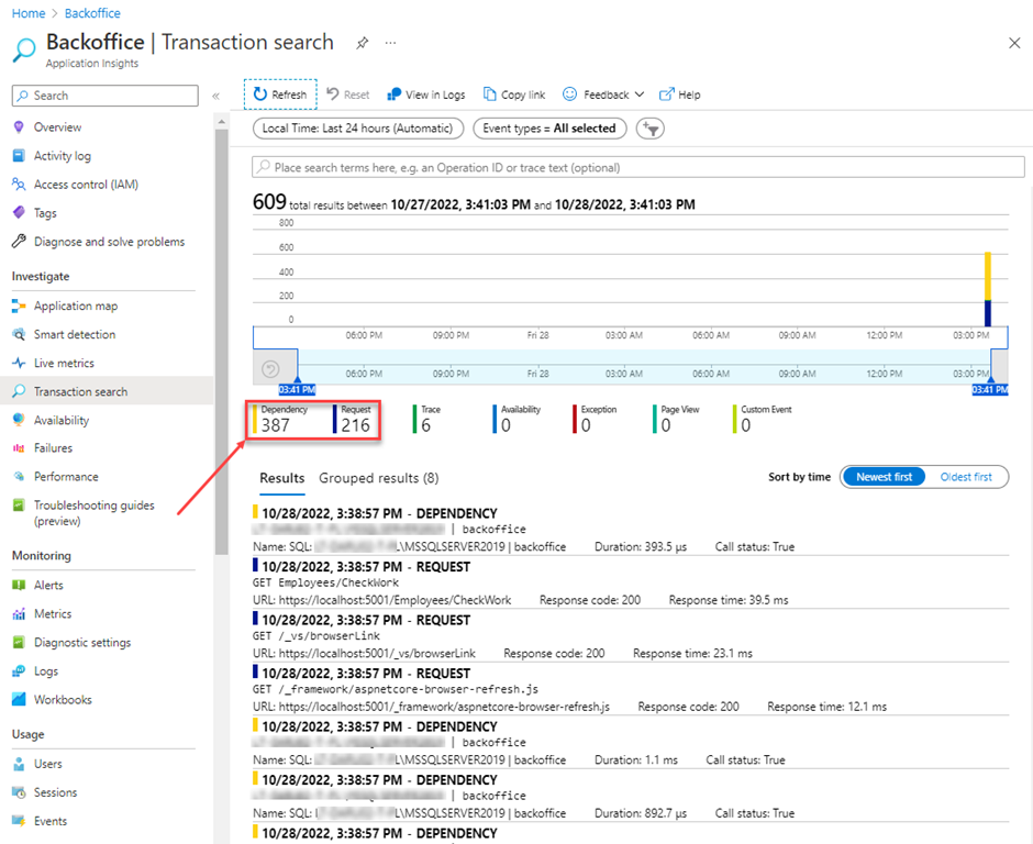 Few clicks and we have plenty of dependency and request metrics collected. And that application is not even using custom events or page view metrics which can heavily increase the amount of that which will be stored by Application Insights!