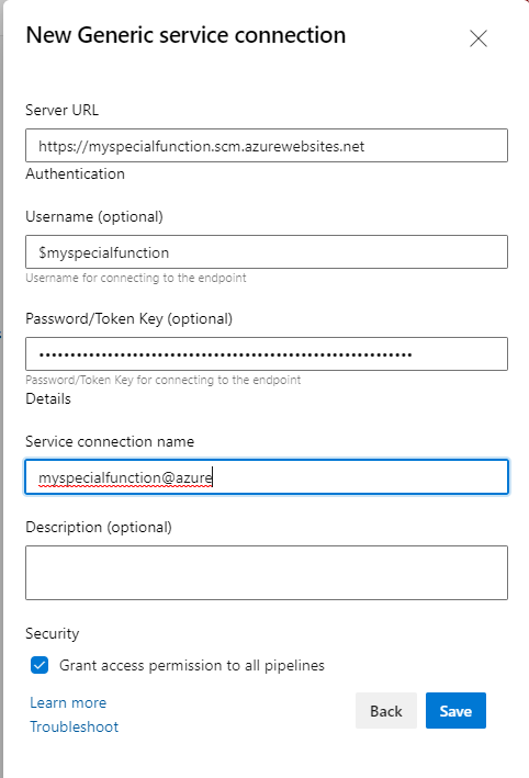 Now go to the DevOps portal, navigate to the project of your function code. Go to project settings and add new Generic service connection in Service connections section. As a server url type in the publishurl with https:// and as a user and password corresponding values from Zip deploy section of publish profile above