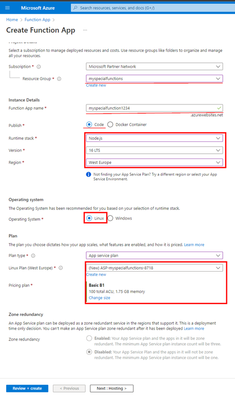 Important note regarding service plan: You cannot select Consumption (serverless) plan for linux, because running functions from package is not supported for linux for that plan. Choose one of the payed plan, for example B1 as shown above.