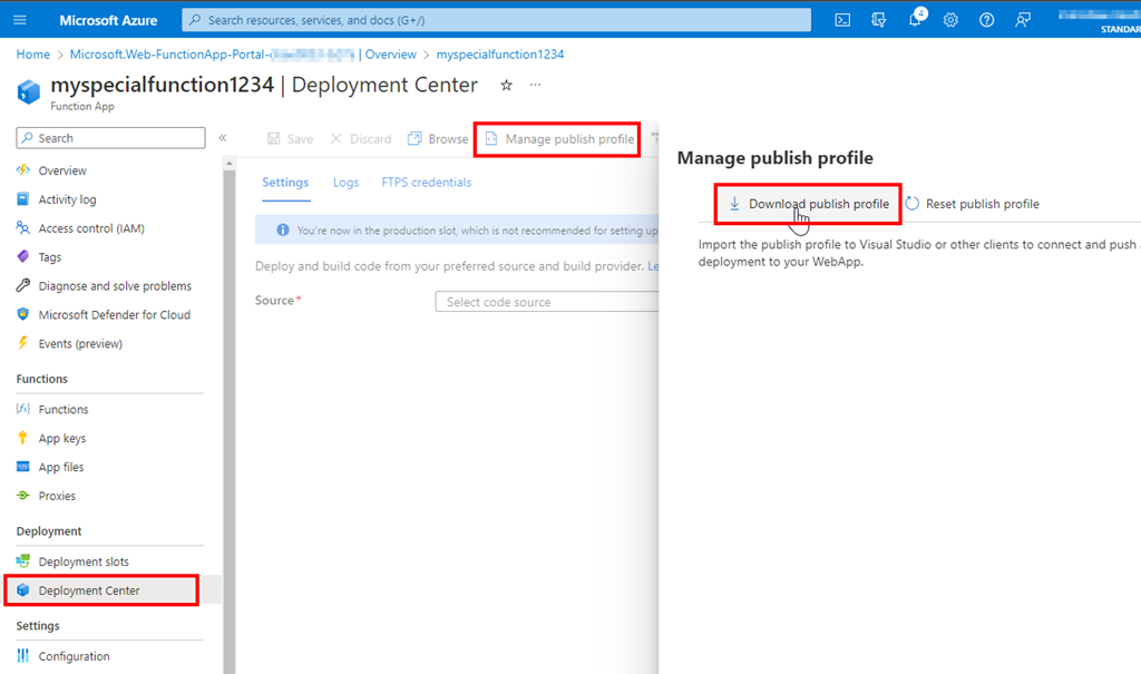 Next we need to get the zip deployment credentials, that we will configure in DevOps as service connection later. The easiest way is to go to Deployment Center and grab the publish profile file