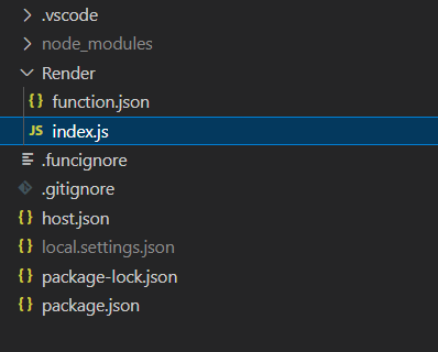 Start new Visual Studio Code and follow this Microsoft quide to create new Azure Function project from the template. When its about to create azure resources remember to choose Node js as runtime stack and Linux as operating system. Also give the function name: Render. Once you’ve done that you should see following file structure in your project