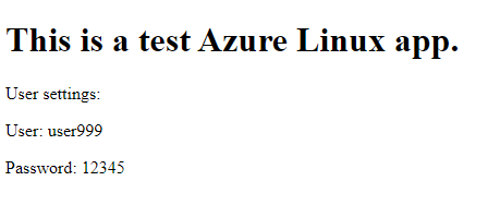 That will set the user name to user999 and password to 12345. Note how the appsettings.json tree structure is being flatten here with use of ‘__’ (double underscore). This delimiter is specific for Linux based deployment as for Windows based deployments you will use ‘:’ (colon). For more information about application settings in App Service refer to the documentation.